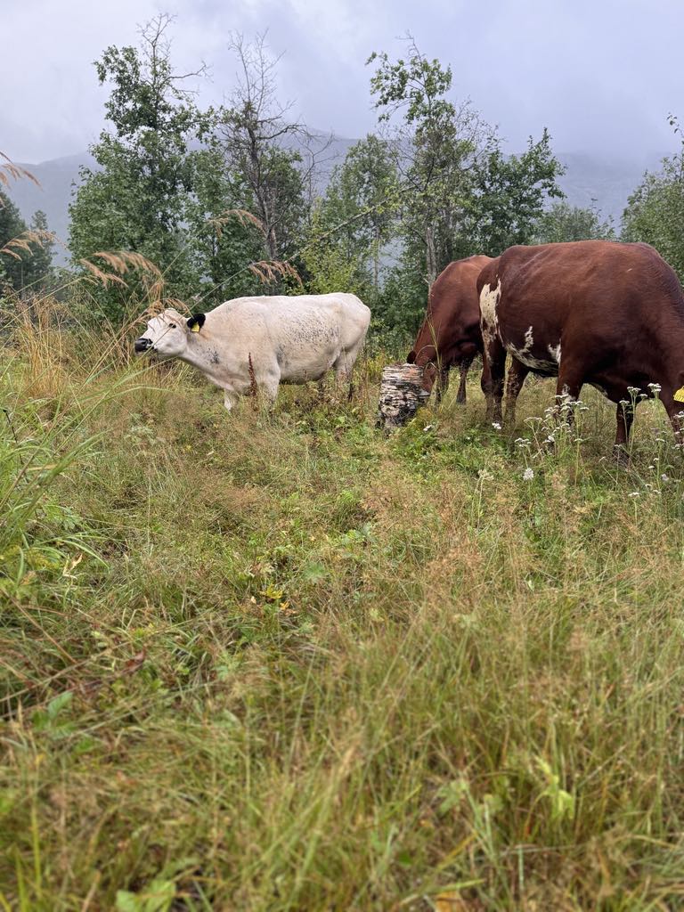 Bildet viser aktuell STN-melkeku (hvit ku) som ble feilvurdert til kalv av liten vekst på høstbeite sammen med to NRF