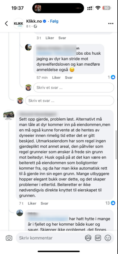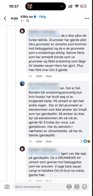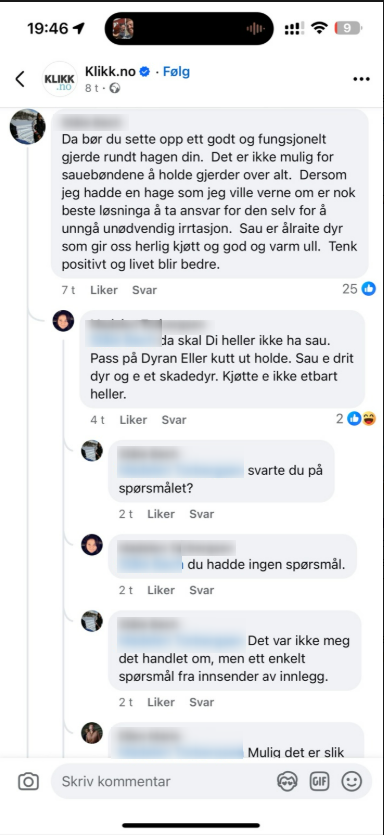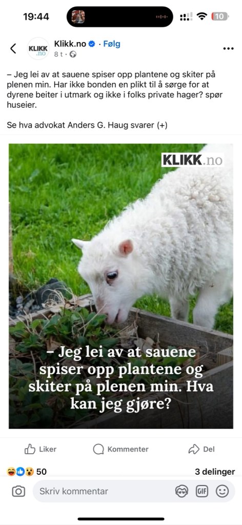 Het diskusjon på på facebook under artikkelen «Jeg er lei av at sauene spiser opp plantene og skiter på plenen min. Hva kan jeg gjøre? Min umiddelbare tanke – gjerd inn hagen din!